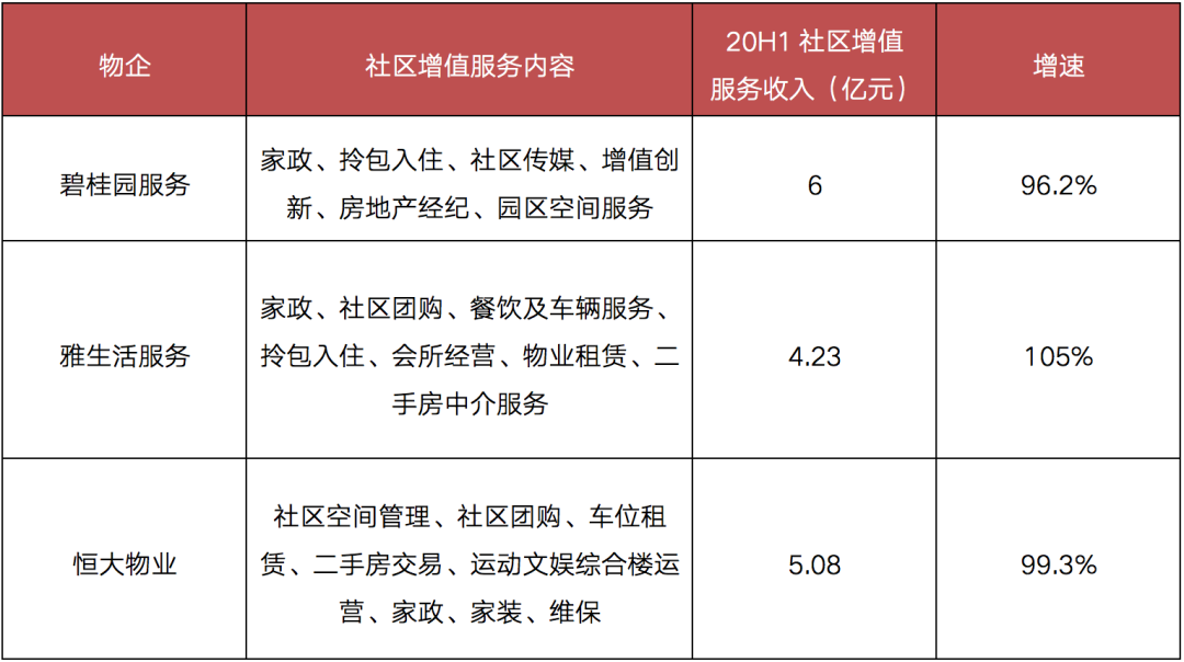 表:20H1部分龍頭物企社區(qū)增值服務(wù)內(nèi)容及收入情況