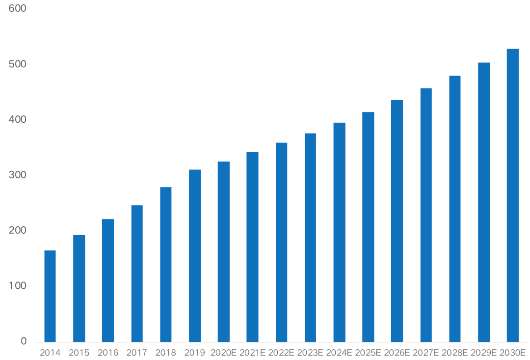 隨著房地產(chǎn)逐步進(jìn)入“無增長”時代,物業(yè)管理行業(yè)仍保持快速發(fā)展。根據(jù)克而瑞物管研究,國內(nèi)物業(yè)管理行業(yè)管理面積持續(xù)走高,2020年行業(yè)管理規(guī)模超過300億平方米,近5年復(fù)合增長率超11%。綜合考慮考慮現(xiàn)有存量物業(yè)覆蓋率提升、房地產(chǎn)開發(fā)增量、非房地產(chǎn)開發(fā)物業(yè)增量以及城市服務(wù)、鄉(xiāng)鎮(zhèn)治理等領(lǐng)域的發(fā)展,預(yù)計2030年我國物業(yè)管理行業(yè)管理規(guī)模或接近500億平方米。按照500強(qiáng)物業(yè)服務(wù)企業(yè)平均物業(yè)費3.09元/平米·月,并考慮一定的物業(yè)費價格增長,預(yù)計2030年基礎(chǔ)物業(yè)服務(wù)市場規(guī)模將超過2萬億。