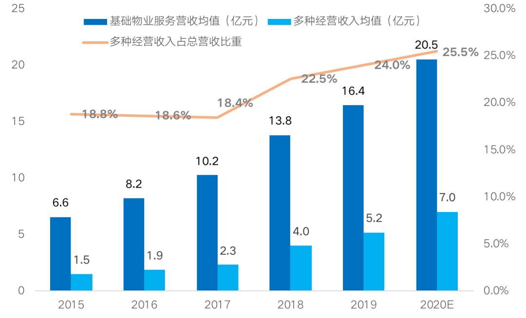 圖:2015-2020年(預(yù)估)百強(qiáng)物業(yè)服務(wù)企業(yè)營收結(jié)構(gòu)及占比