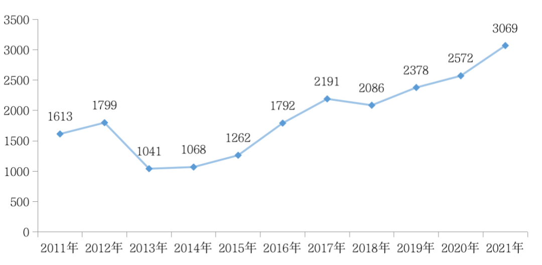 圖:2011年-2021年全國300城土地成交樓板價走勢(單位:元/平方米)