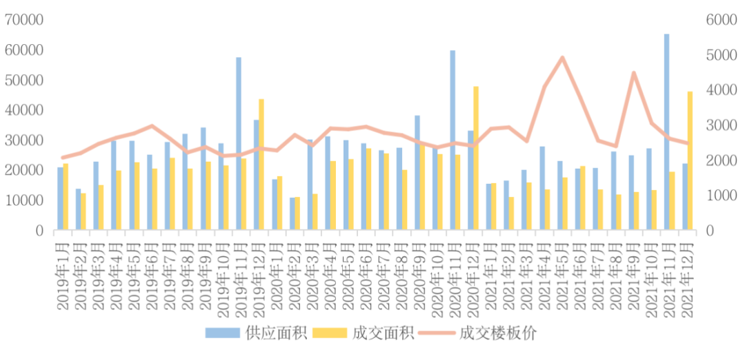 在融資收緊、土地供給端改革的影響下,2021年的土地市場經歷了由高熱降至低溫的劇變。和前年相比,2021年土地成交熱度也明顯走低,不僅成交建面低于前年,成交金額也出現了近六年來的首次下滑,溢價率、流拍率等熱度指標表現也差于前年同期。