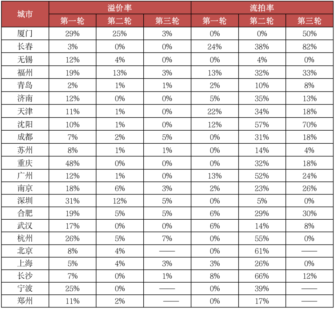 表:部分城市三輪土拍溢價率、流拍率對比