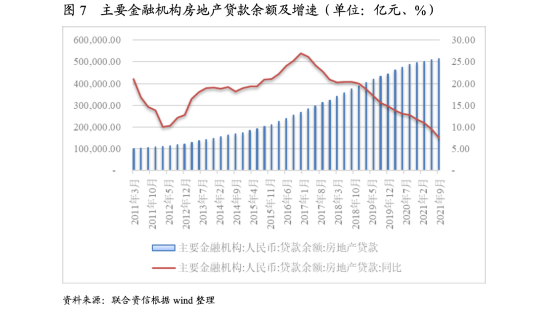從房地產企業主要融資渠道銀行信貸來看,銀行信貸流向房地產領域的增速持續下降。截至2021年三季度末,國內主要金融機構房地產貸款余額為514000億元,同比增長7.6%,增速為2011年以來首次連續兩個季度低于兩位數,增速創歷史新低。同時考慮到“房住不炒”的整體政策基調以及金融機構房地產貸款集中管理制度的影響,預計主要金融機構仍將壓降房地產貸款增速。