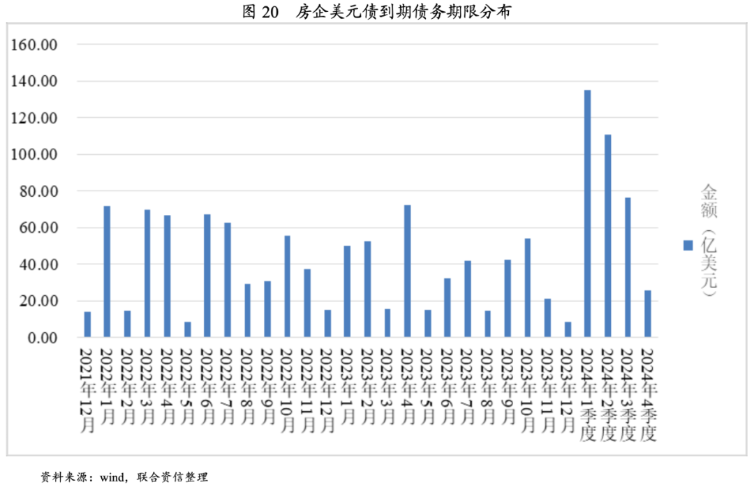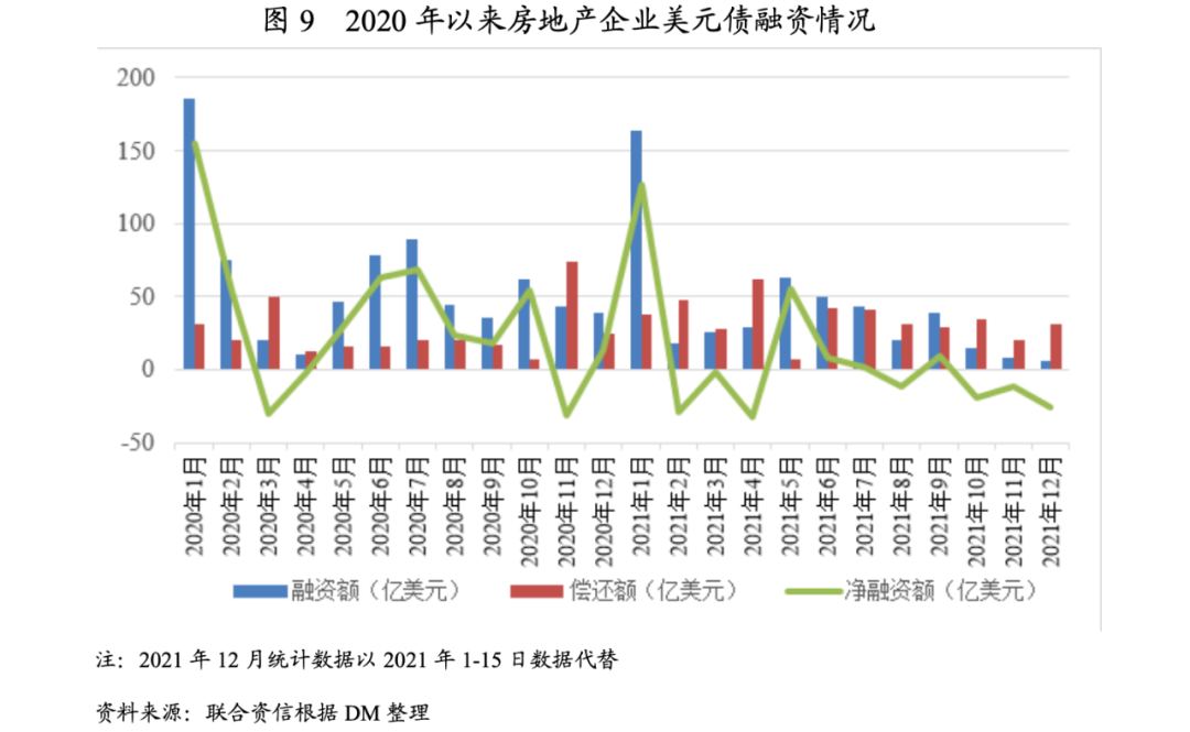 從房企到期債務分布來看,境內債券將在2022年3-5月迎來集中兌付期,美元債將在2022年1月、3月、4月和6月迎來償債高峰期。目前境內外融資環境下,大部分房企尚不能實現借新還舊,境內外債券的償還仍將嚴重依賴于銷售回款,因此2021年12月份及2021年1季度各房企的銷售情況直接影響到期債券的兌付,需持續關注房企銷售回款情況與流動性風險情況。