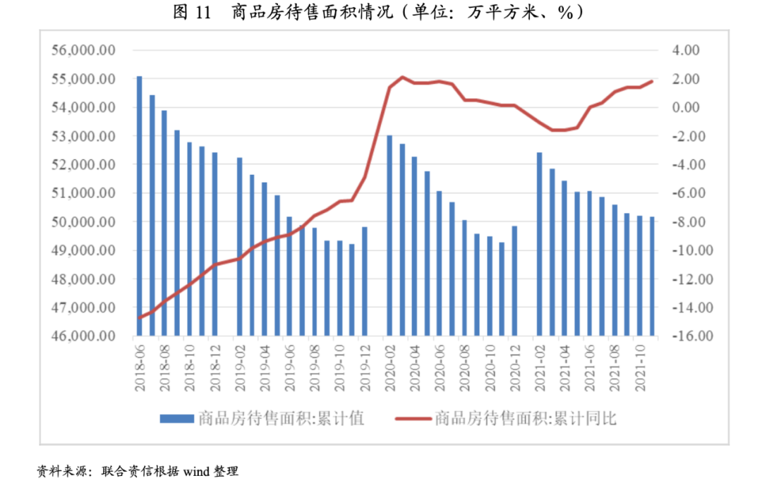 從商品房待售面積(竣工未售項目)看,2021年下半年,房地產行業市場景氣度持續下行,截至11月底,已竣工商品房庫存同比增速已上升至1.78%,待售面積規模為50165.00萬平方米。