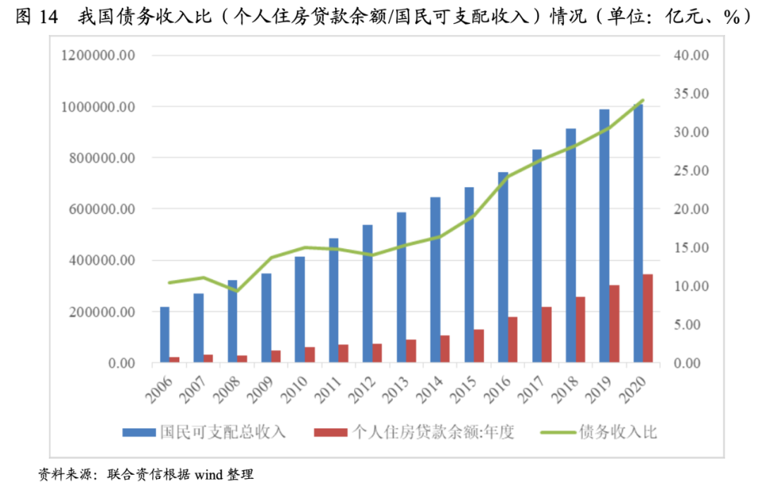 長期看,需求的硬上限為人口和購買力,我們使用居民貸款余額/可支配收入來衡量居民杠桿率水平;我國居民債務收入比總體呈增長態勢,尤其是2009年和2016年增速較快,主要受國家信貸政策放松影響。2020年,居民收入水平受疫情影響增速放緩,居民債務收入比(個人住房貸款余額/國民可支配收入)提升至34.18%。