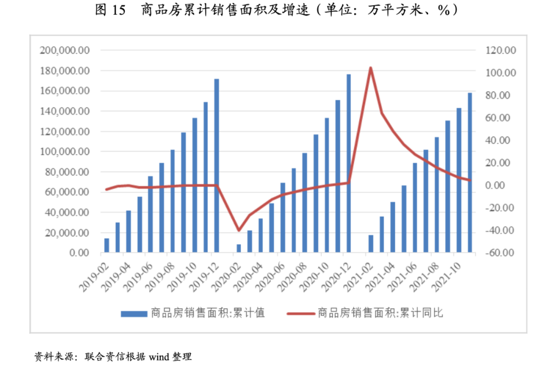 短期看,商品房的需求與貨幣政策及購房者的預期息息相關。2021年1-11月,行業商品房銷售面積同比增長4.80%至15.81萬平方米,商品房銷售額同比增長8.50%至16.17萬億元,但上下半年,國內房地產銷售市場可謂冰火兩重天。2021年上半年,商品房銷售面積較2020年同期增長27.70%,較2019年同期增長16.96%;下半年,政府管控按揭力度,直接抑制了部分置換需求,此外房企為回籠資金促銷部分樓盤,樓盤價格下降壓低了購房者對未來的預期,商品房市場景氣度迅速回落,7-11月單月銷售面積環比增速分別為-8.54%、-15.55%、-13.17%、-21.65%和-13.97%。