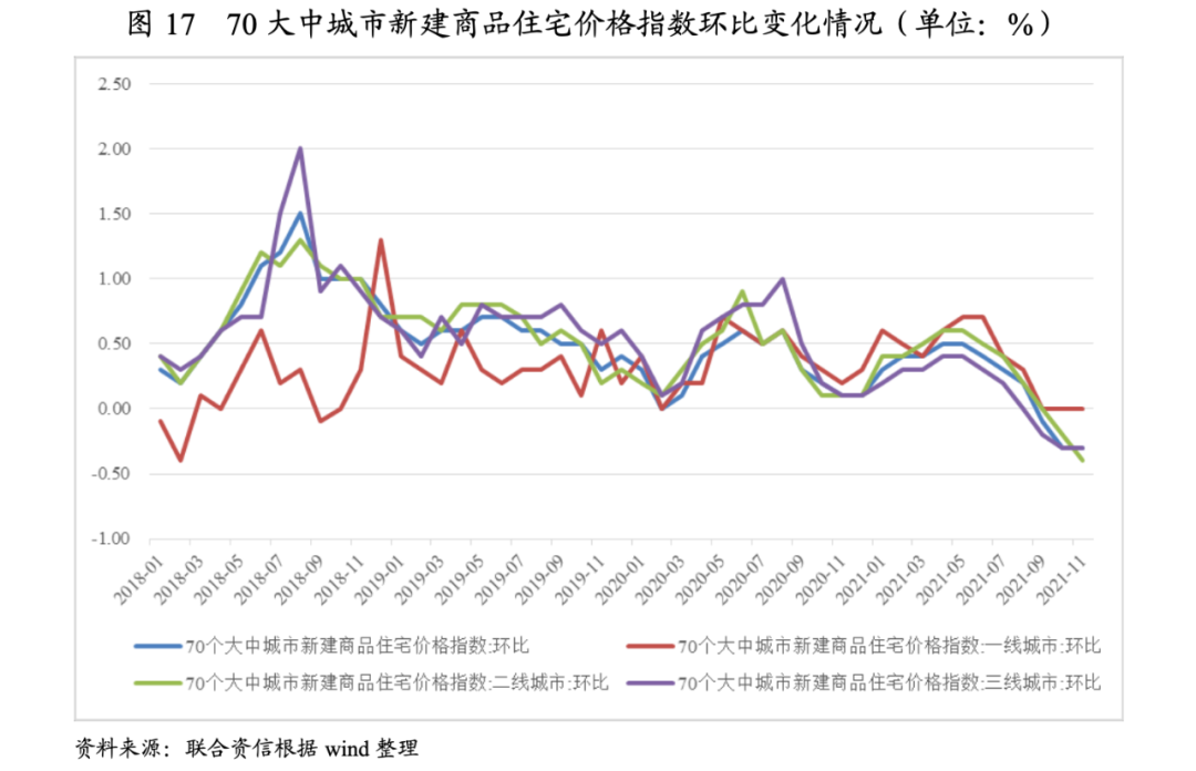 從70大中城市新建商品住宅價格指數看,進入2021年,上下半年價格變動呈現明顯的分化特征:上半年,一、二、三線城市住宅價格指數環比均保持正增長,且增幅持續增加;下半年住宅價格環比急轉急下,隨著購房者房價上漲預期的降低,各線城市價格自9月份開始回落,其中一線城市相對保持穩定,二、三線城市有繼續下探趨勢。從二手房出售掛牌價格看,8月后各線城市價格均呈現波動后下降態勢,但目前看降幅較小。