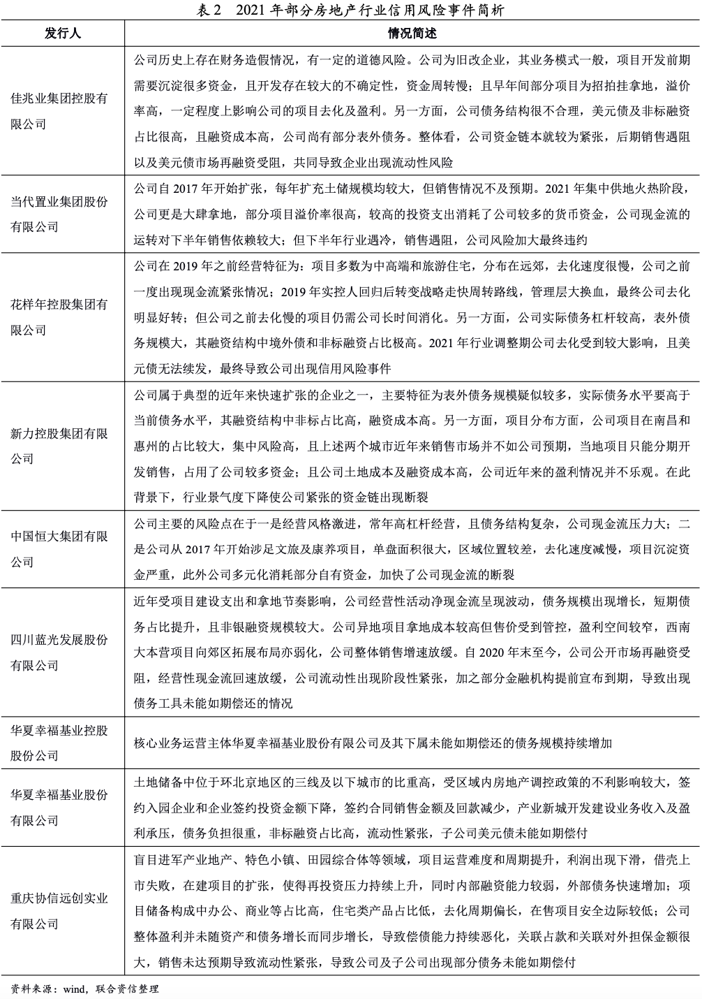 2021年以來,發生信用風險事件的部分房企主要呈現實際債務杠桿高,美元債和非標融資占比高;項目質地差,行業下行周期去化受影響更甚等特征,具體明細如下。