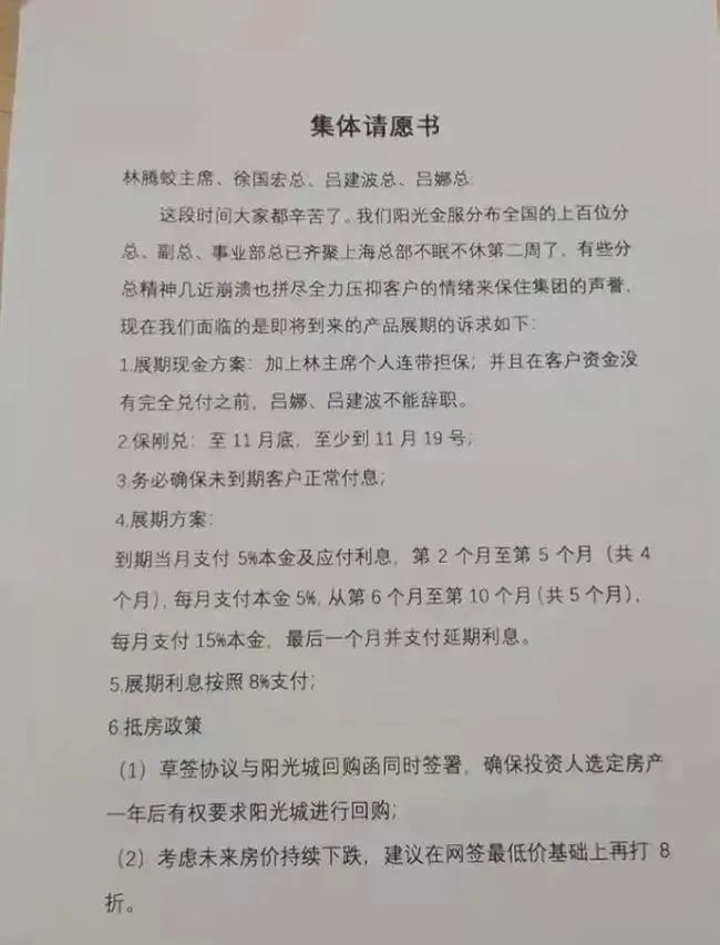 市場傳言,11月初林騰蛟曾遭陽光金服(員工理財(cái)平臺華冕財(cái)富母公司)的百名高管聯(lián)合“逼宮”,要求對理財(cái)產(chǎn)品展期兌付進(jìn)行擔(dān)保和賠付。