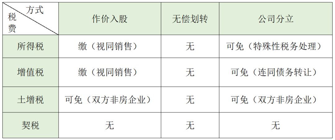 從表可以看出,資產劃轉模式下,子公司只涉及印花稅,免征契稅。