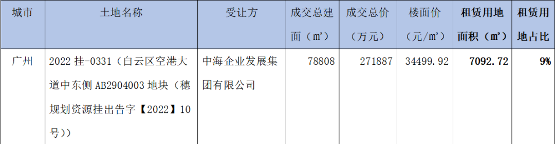 廣州、濟南、蘇州、福州、廈門五城涉租賃用地,共成交10宗,租賃總建面約24.24萬方。其中廣州成交4宗涉租賃用地,租賃總建面約10.45萬平方米居于首位。