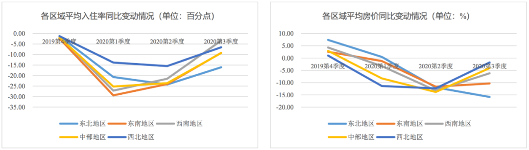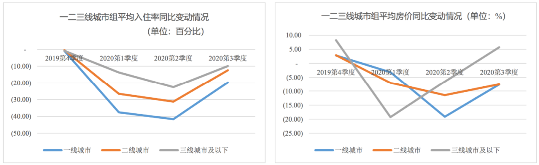 從不同等級城市組看,一二三線城市組酒店業在上半年均受疫情影響嚴重,三季度均有所好轉,但不同等級城市組恢復情況有所不同。其中,一二季度房價和入住率下跌幅度從小到大為三線城市組、二線城市組和一線城市組,三線城市組酒店業受損相對較小;而三季度酒店業恢復程度由好到弱同為三線城市組、二線城市組和一線城市組。整體看,三線城市酒店業受疫情影響相對較小、恢復較快;而一二線城市酒店客源因全球疫情影響海外客源大幅減少并尚未完全恢復,且一二線城市管控更嚴,酒店業恢復程度較慢。