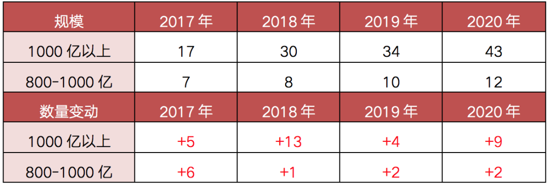 截至2020年末,全口徑千億房企數量相比去年增加9家至43家,規模為800-1000億的房企數達到12家,800億以上房企梯隊繼續擴容。