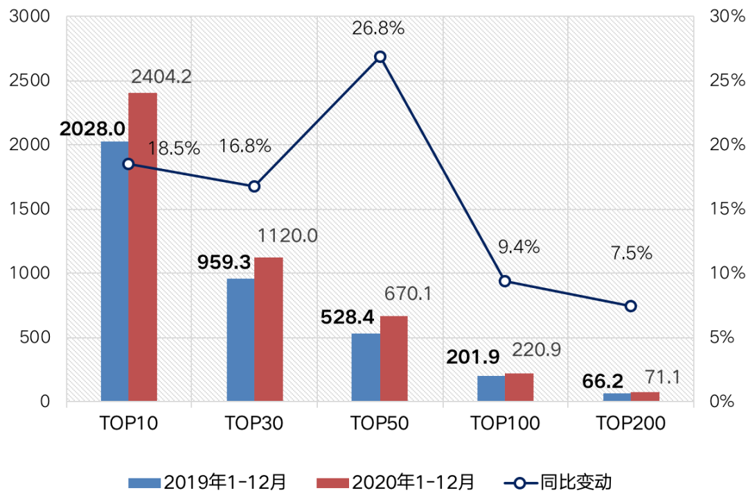 2020年,百強房企各梯隊銷售金額入榜門檻同比提升。其中,TOP10和TOP30房企操盤金額門檻分別提升18.5%和16.8%至2404.2億元和1120億元。TOP50房企競爭格局加劇,操盤金額門檻670.1億元,同比增幅最高達26.8%。另截至12月末,TOP100房企操盤金額門檻也同比增長9.4%至220.9億元,而TOP200房企門檻提升幅度不大。