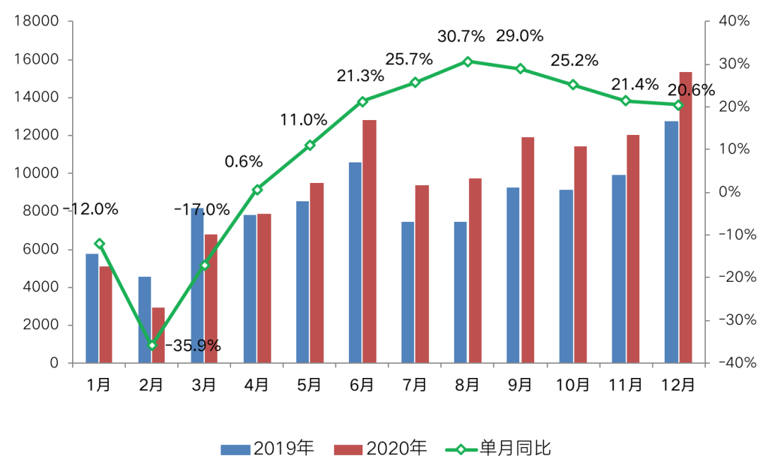 2020年,中國房地產市場整體銷售表現受疫情影響較大。在疫情對房地產市場的沖擊下,無論是全國商品房的銷售面積、銷售金額還是行業百強房企的業績規模,年內都保持了較長時間的負增長。其中,2020年全國商品房累計銷售面積的同比增速直至10月末才得以轉正。