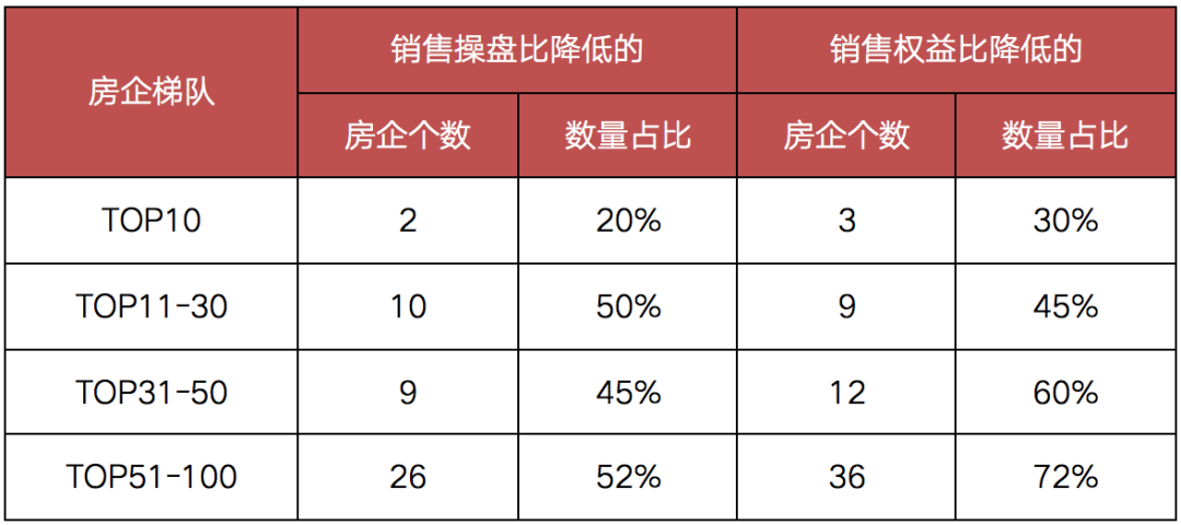 另一方面,當前市場背景下,隨著更多的中小規模企業通過合作開發提升全口徑業績規模,其整體的項目操盤和權益比例也相應降低。2020年在TOP51-100梯隊房企中,銷售操盤比、銷售權益比降低的房企個數為26家和36家,占比分別達到52%和72%且高于其他梯隊房企。