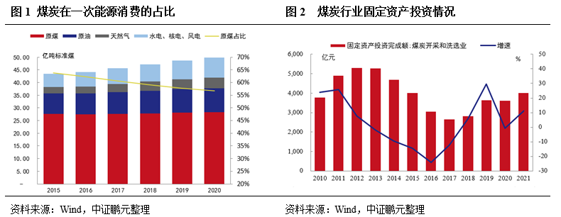 長(zhǎng)期來(lái)看,雙碳目標(biāo)下煤炭消費(fèi)將步入下行周期。《碳達(dá)峰行動(dòng)方案》中提出“十四五”時(shí)期嚴(yán)格合理控制煤炭消費(fèi)增長(zhǎng),“十五五”時(shí)期逐步減少,“嚴(yán)格控制新增煤電項(xiàng)目、有序淘汰煤電落后產(chǎn)能,推動(dòng)煤電向基礎(chǔ)保障性和系統(tǒng)調(diào)節(jié)性電源并重轉(zhuǎn)型”,政策著力于從煤炭下游需求進(jìn)行逐步替代。在能源轉(zhuǎn)型的大背景下,隨著水電、風(fēng)電、光伏發(fā)電等清潔能源機(jī)組裝機(jī)量的提升,未來(lái)煤電機(jī)組將主要作為調(diào)節(jié)性電源的角色發(fā)揮調(diào)峰功能。中證鵬元預(yù)計(jì),在“碳達(dá)峰”前后煤炭消費(fèi)將步入下行周期,其在一次能源消費(fèi)中的份額將逐漸被新能源所替代。