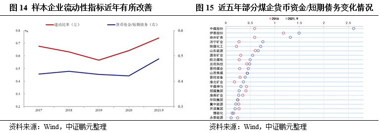 樣本企業(yè)流動(dòng)性指標(biāo)近期有所改善。截至2021年9月末,樣本企業(yè)速動(dòng)比率和貨幣資金/短期債務(wù)中位數(shù)分別為0.74和0.49,較2020年末分別上升0.10和0.07,流動(dòng)性指標(biāo)邊際改善。截至2021年9月末,速動(dòng)比率大于1的企業(yè)共7家,貨幣資金/短期債務(wù)大于1的企業(yè)共9家,整體水平仍較低且內(nèi)部仍有一定分化。中證鵬元預(yù)計(jì)在短期內(nèi)行業(yè)景氣度維持的情形下,行業(yè)流動(dòng)性壓力邊際緩解,樣本企業(yè)短期償債指標(biāo)將維持小幅改善,但考慮到市場(chǎng)對(duì)行業(yè)仍存謹(jǐn)慎態(tài)度,煤企仍以中短期融資為主,短期償債能力指標(biāo)仍將維持較弱水平,需繼續(xù)關(guān)注弱資質(zhì)煤企的短期償債能力變化。
