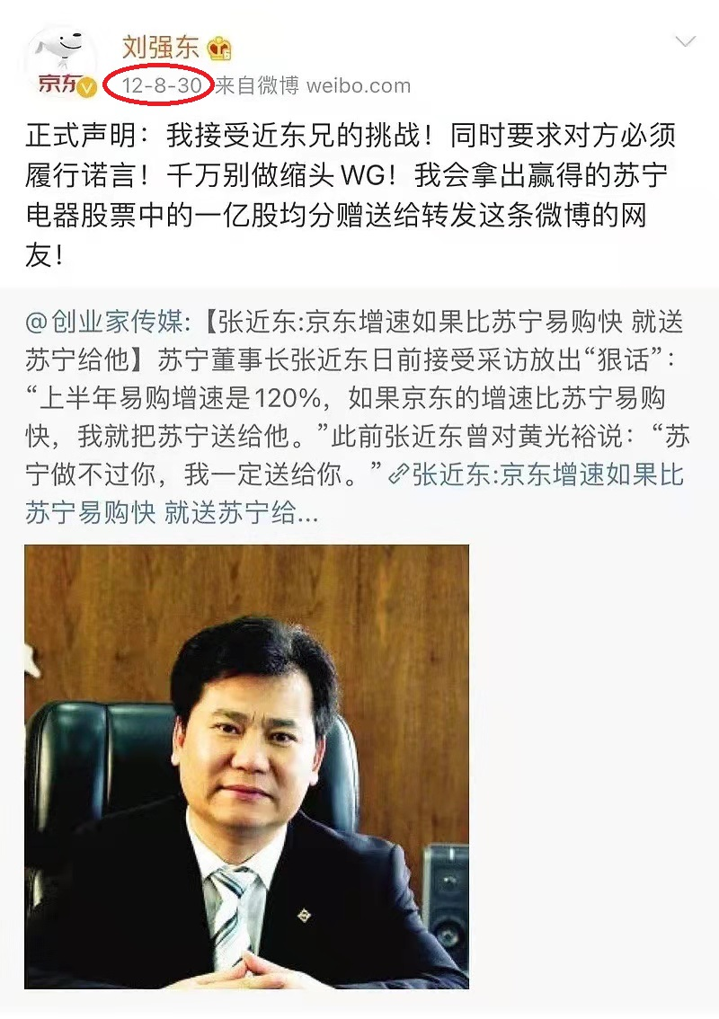 2012年,如日中天的張近東遭遇江蘇老鄉(xiāng)劉強東“當頭一棒”。當年8月14日,劉強東率先發(fā)起價格戰(zhàn),聲稱京東大型家電三年內(nèi)零毛利,保證比蘇寧連鎖門店便宜10%以上。張近東接受挑戰(zhàn),開始降價,并大力發(fā)展線上商城、加強物流建設(shè),還承諾線上線下同價。