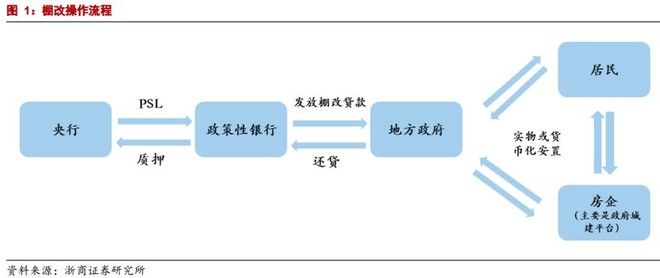 目前,棚改貨幣化支付的資金來源主要是財政撥款和政策性銀行(如國開行、農發(fā)行)貸款,其中政府以土地為抵押向政策性銀行貸款是主要獲得棚改資金的方式。根據浙商證券的研報,具體流程如下: