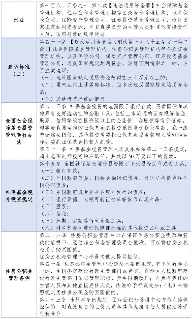 根據(jù)《刑法》第96條的規(guī)定,刑法中所稱的“違反國(guó)家規(guī)定”是指違反全國(guó)人民代表大會(huì)及其常務(wù)委員會(huì)制定的法律和決定,國(guó)務(wù)院制定的行政法規(guī)、規(guī)定的行政措施、發(fā)布的決定和命令。由此可知,立法者更傾向于對(duì)違法運(yùn)用資金罪的違法依據(jù)采取嚴(yán)格解釋,即將規(guī)范性文件的制定主體限定在全國(guó)人大及其常委會(huì)和國(guó)務(wù)院。具體而言,包括:(1)國(guó)家關(guān)于社會(huì)保障基金、住房公積金運(yùn)用的相關(guān)規(guī)定,如《全國(guó)社會(huì)保障基金投資管理暫行辦法》、《全國(guó)社會(huì)保障基金境外投資管理暫行規(guī)定》、《住房公積金管理?xiàng)l例》等;(2)國(guó)家對(duì)保險(xiǎn)公司、保險(xiǎn)資產(chǎn)管理公司、證券投資管理公司運(yùn)用資金的規(guī)定,如《保險(xiǎn)法》、《證券法》、《證券投資基金法》、《證券投資基金管理公司管理辦法》等。上述規(guī)定部分內(nèi)容已列于本文第一部分。