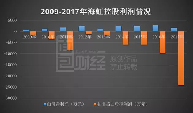 財報顯示,自2009至2017年,海虹控股歸母凈利潤維持盈利,但扣非后歸母凈利潤卻已連續9年為負值。以下是公司歷年歸母凈利潤與扣非凈利潤走勢圖: