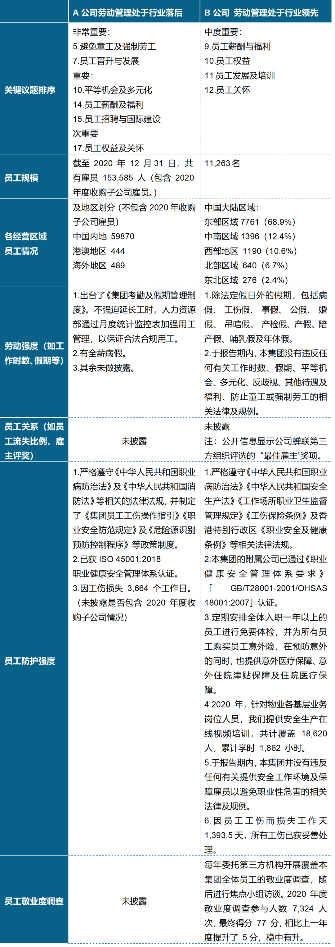 港股上市物企中,大部分關鍵議題的披露處于行業平均水平,但在勞動管理關鍵議題上,有物企處于行業落后水平,也有物企處于行業領先水平。根據MSCI官網顯示,勞動管理指公司根據其勞動力的復雜性(規模、勞動強度和經營區域)、員工關系、工人防護強度以及員工敬業度進行評估,MSCI并沒有對勞動管理這一關鍵議題的具體評判標準予以公示。但除員工敬業度調查之外,其余內容基本為聯交所規則要求ESG報告披露內容。故根據MSCI對勞動管理解釋的幾個方面的理解,以兩家上市物企2020年ESG報告的信息披露對比如下: