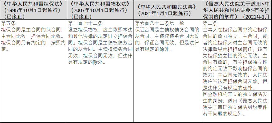 在金融實踐中,各類投資機構的投資合同文本中,投資合同及保證擔保合同中的擔保獨立性條款是必備條款,意在根據《擔保法》第五條充分保障投資人的投資安全。同時,包括銀保監會在內的監管機構,對于債權類投資中的擔保合同,具備擔保獨立性條款一直是審查要件之一,直到民法典全文公布后,該等審查口徑才有所放松。因此,在民法典頒布實施前,債權類金融投資項目的擔保合同中,具備擔保獨立性條款是慣例。民法典頒布實施后,已經存在的擔保獨立性條款是否持續有效,就成了業內較為關注的問題之一。