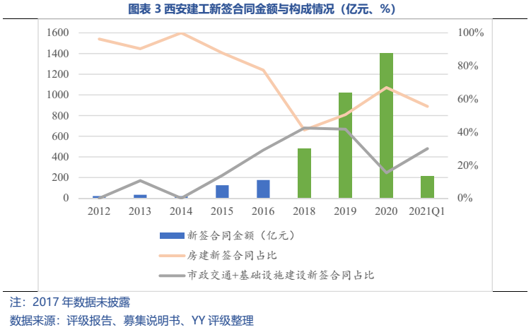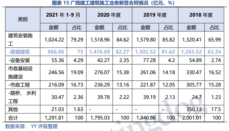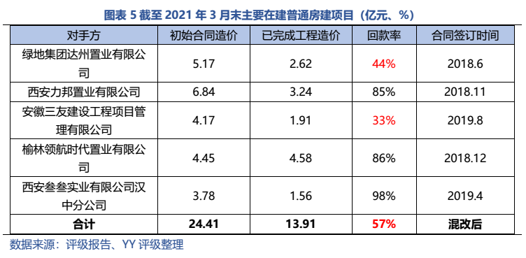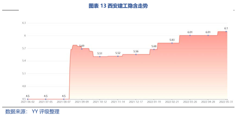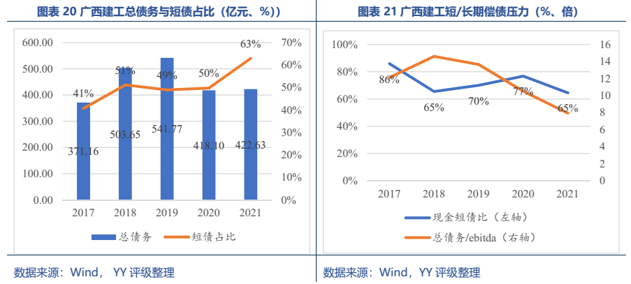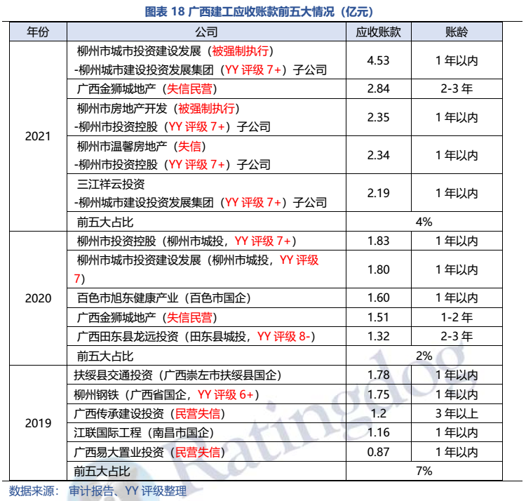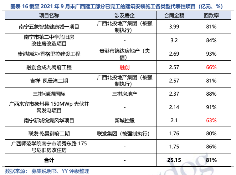 梳理分析下來,可知西安建工混改完成后新簽合同大幅增加,同時,房建占比提升,展業(yè)區(qū)域由西安市內拓展至西北區(qū)域;對綠地風險敞口51億元,其他對手方以民營房企和弱國企為主,資質較弱;綠地展期后,暫無前臺成交,預計后續(xù)隱含將明顯弱化。廣西建工混改完成后業(yè)務變化不大,仍以房建為主,集中在廣西展業(yè);與綠地資金牽連不大(或未披露),但業(yè)務對手方資質弱,以出險房企、失信民營房企和弱城投為主;在年內到期或行權債券約60億元的情況下,綠地展期后隱含急劇弱化,YY隱含飆升至20以上。