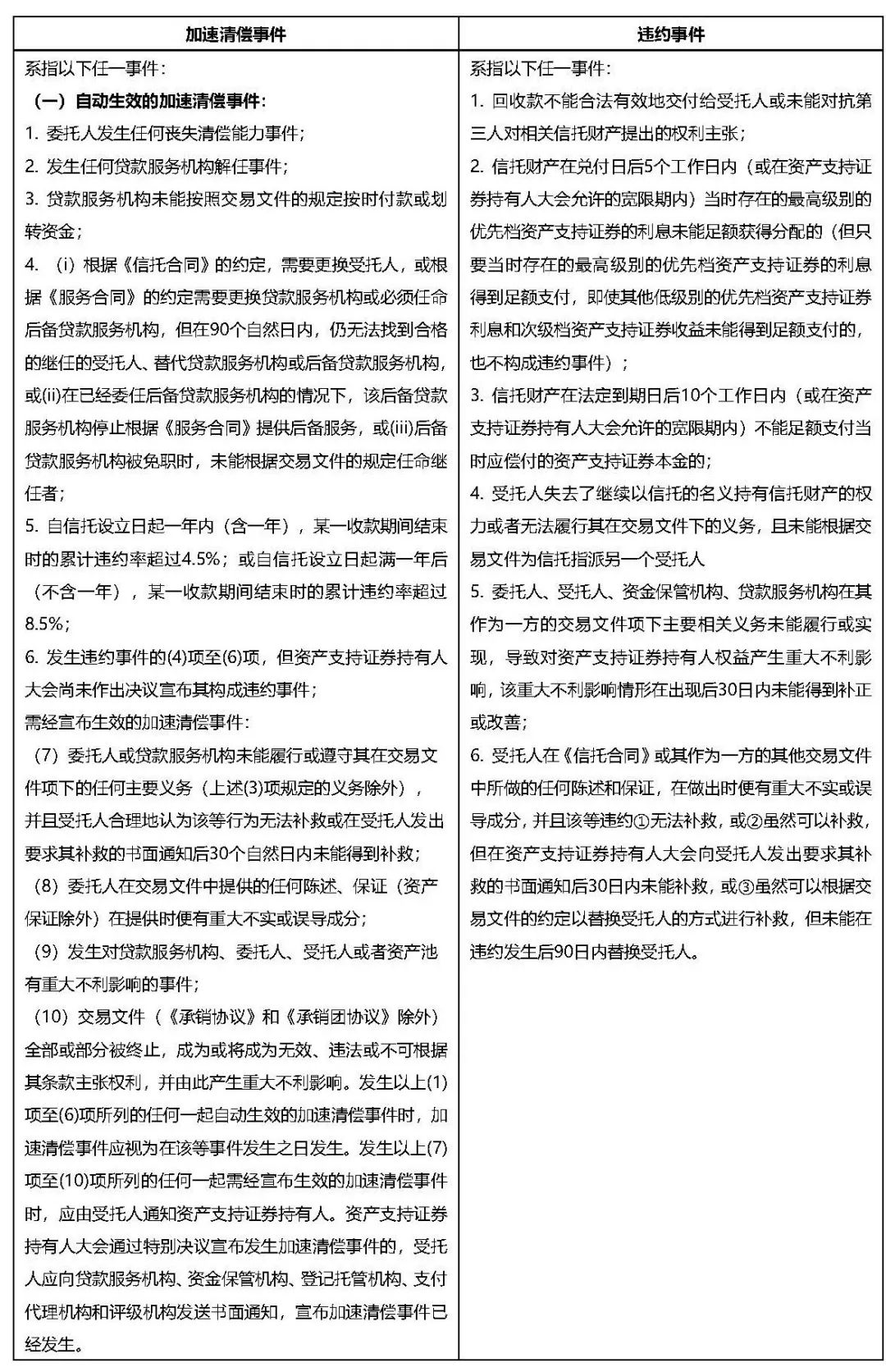 加速清償事件和違約事件均屬于信用觸發(fā)事件的范疇。信用觸發(fā)事件是指在不利于優(yōu)先級資產(chǎn)支持證券償付的情況達到一定觸發(fā)條件后引發(fā)的事件,根本目的是當(dāng)資產(chǎn)池質(zhì)量發(fā)生負面變化時,通過改變現(xiàn)金流支付機制的重新安排讓基礎(chǔ)資產(chǎn)現(xiàn)金流首先保障優(yōu)先檔證券的本息兌付。加速清償事件一般同參與機構(gòu)履約能力、資產(chǎn)支持證券兌付相關(guān);違約事件一般同資產(chǎn)支持證券兌付相關(guān)的違約事件。