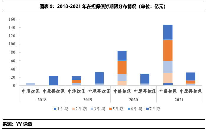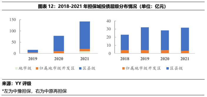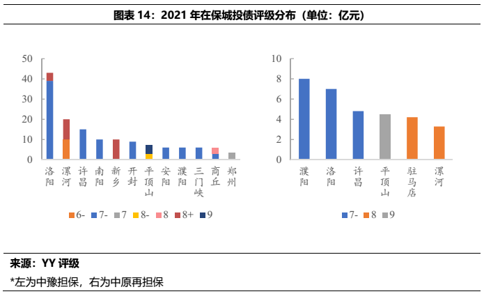 從中豫擔保和中原再擔保的展業情況看,二者僅在省內展業,中豫擔保在主要的直保業務上規模遠大于中原再擔保,同時二者債券擔保中城投占比很高,2021年的在保城投債分別占總擔保債券的97%(中豫增)和100%(中原再擔保)。所擔保城投債YY評級集中在7檔和8檔,所處行政區域中以區縣級為主,各城市中洛陽市的擔保體量較為突出,其次是許昌、漯河和新鄉。