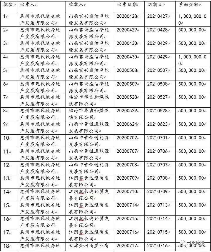 風財訊獲悉一張電子商業承兌匯票顯示,12億融資性票據中,于今年4月27日至30日到期的部分票面為50萬及100萬的最新票據狀態顯示“提示付款已拒付”,出票人為惠州市現代城房地產發展有限公司,收款人名稱均為山西富興盛潔凈能源發展有限公司。