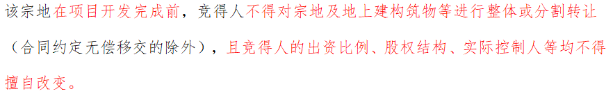 (2)對(duì)競(jìng)拍主體競(jìng)得土地后的股權(quán)變更限制越來(lái)越多,比如需穿透到上面第三層級(jí)的股東,甚至不允許競(jìng)得主體的實(shí)控人發(fā)生變更。例(某市集中拿地掛牌公告中關(guān)于競(jìng)得主體不得變更的要求):