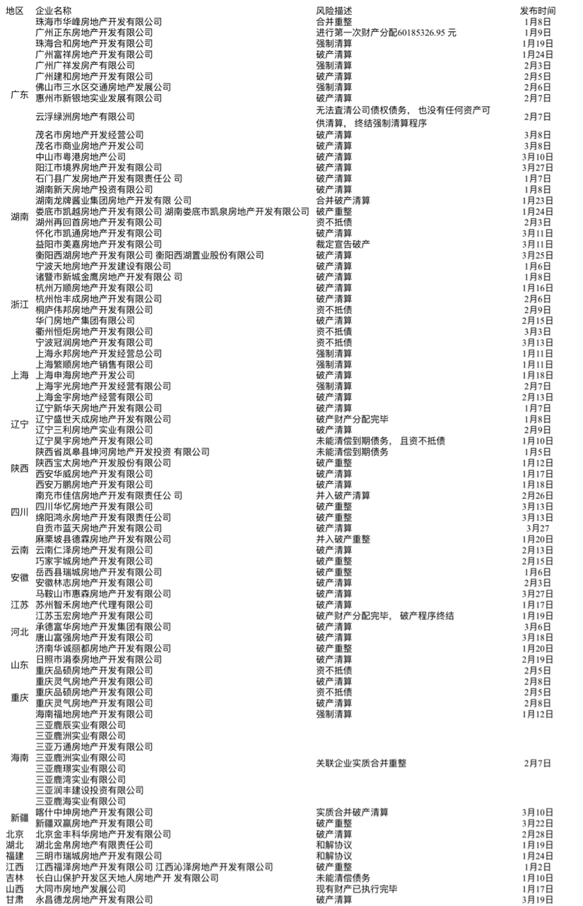 媒體披露的數據顯示,從2019年開年到2019年12月12日,宣告破產的房企為492家。另據金角財經不完全統計數據,2020年元旦到2020年2月,僅僅兩個月,房地產行業內就有70家房企有破產文書發布。睿和智庫也搜集了2020年部分房企破產的信息,見下表: