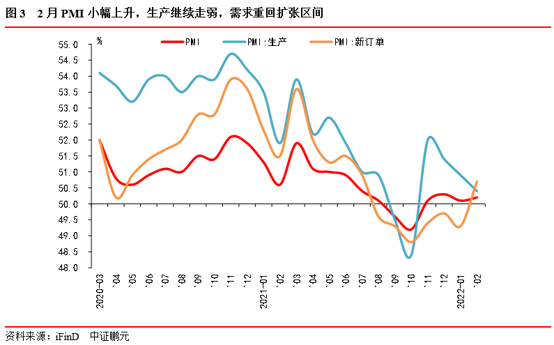 一,PMI小幅上行,新訂單指數(shù)重回?cái)U(kuò)張區(qū)間,需求強(qiáng),生產(chǎn)弱,預(yù)期強(qiáng)。2月PMI指數(shù)為50.2%,小幅上升0.1個(gè)百分點(diǎn),非制造業(yè)商務(wù)活動(dòng)指數(shù)為51.6%。受季節(jié)性和春節(jié)因素影響,生產(chǎn)指數(shù)為50.4%,比上月下降0.5個(gè)百分點(diǎn),生產(chǎn)雖小幅放緩但仍高于臨界點(diǎn);生產(chǎn)經(jīng)營(yíng)活動(dòng)預(yù)期為58.7%,較上月大幅增加1.2個(gè)百分點(diǎn),穩(wěn)增長(zhǎng)預(yù)期強(qiáng)。新訂單指數(shù)為50.7%,比上月上升1.4個(gè)百分點(diǎn),需求端時(shí)隔6個(gè)月重回?cái)U(kuò)張區(qū)間。主要原材料購(gòu)進(jìn)價(jià)格和出廠價(jià)格大幅上漲。