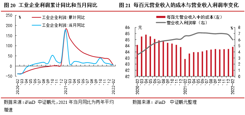 1-2月份,全國(guó)規(guī)模以上工業(yè)企業(yè)實(shí)現(xiàn)利潤(rùn)總額11,575.6億元,同比增長(zhǎng)5.0%,增速較去年12月份回升0.8個(gè)百分點(diǎn)。按可比口徑來(lái)看,1-2月工業(yè)企業(yè)利潤(rùn)較去年12月當(dāng)月同比下滑7個(gè)百分點(diǎn)(去年12月兩年平均增速為12.0%),主因2021年高基數(shù)影響。總體來(lái)看,工業(yè)企業(yè)效益狀況延續(xù)了去年以來(lái)的恢復(fù)態(tài)勢(shì)。工業(yè)企業(yè)利潤(rùn)增速受基數(shù)較高影響較去年全年明顯回落,企業(yè)成本壓力加大,利潤(rùn)率和產(chǎn)銷銜接水平均有所下降;企業(yè)盈利改善仍不均衡,下游行業(yè)尤其是中小微企業(yè)利潤(rùn)增長(zhǎng)緩慢,企業(yè)生產(chǎn)經(jīng)營(yíng)還面臨不少困難和挑戰(zhàn),工業(yè)企業(yè)效益狀況持續(xù)恢復(fù)的基礎(chǔ)仍不牢固。