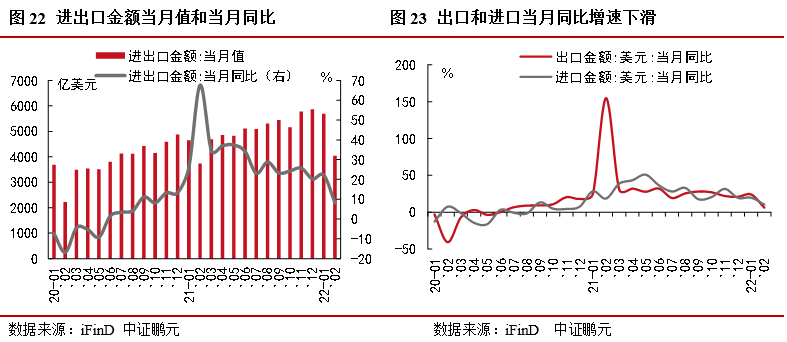2022年1月1日,全球最大的自貿(mào)區(qū)RCEP正式生效,RCEP紅利釋放,關(guān)稅優(yōu)惠凸顯,企業(yè)積極性高,前2月進(jìn)出口保持一定增長(zhǎng),后續(xù)具有韌性。影響出口增長(zhǎng)不利因素一是俄烏沖突等導(dǎo)致大宗商品價(jià)格上漲,壓縮企業(yè)利潤(rùn),地緣政治將會(huì)持續(xù)干擾。另一方面是新冠疫情的影響,此前中國(guó)的動(dòng)態(tài)清零措施和防疫的成功經(jīng)驗(yàn)為出口增加了有利條件,但此次奧密克戎2.0具有高傳染性和低致死率,在國(guó)外普遍放開(kāi)的情況下,我國(guó)的動(dòng)態(tài)清零政策面臨挑戰(zhàn)和壓力,隨著主要出口國(guó)家供應(yīng)鏈的恢復(fù),在內(nèi)外交困下,我國(guó)出口將面臨下滑趨勢(shì)。