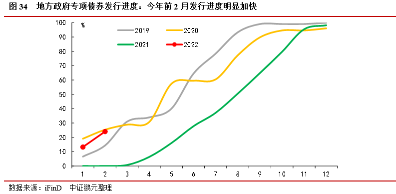 政府性基金支出加快,專項(xiàng)債發(fā)行前置。1-2月累計(jì),全國(guó)政府性基金預(yù)算支出14,042億元,同比增長(zhǎng)27.9%,支出加快,大幅高于去年全年的-3.7%增速。1-2月新增專項(xiàng)債共計(jì)發(fā)行8,775億元,占提前批額度的60.1%,較去年同期明顯加快。1-2月專項(xiàng)債累計(jì)發(fā)行進(jìn)度為24.0%,明顯高于2019年和2021年同期增速,接近2020年25.3%的發(fā)行進(jìn)度,專項(xiàng)債整體節(jié)奏靠前發(fā)力,加快政府性基金支出。