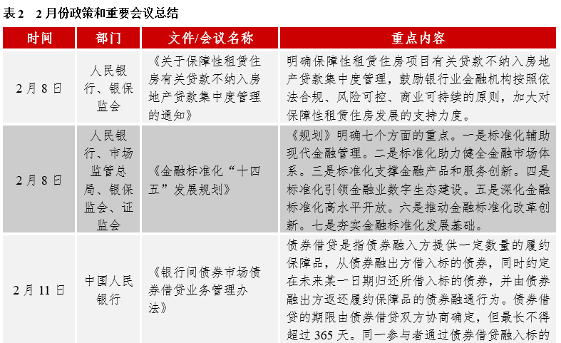 債券市場(chǎng)制度建設(shè)方面:2月8日,人民銀行、市場(chǎng)監(jiān)管總局等部門(mén)聯(lián)合印發(fā)《金融標(biāo)準(zhǔn)化“十四五”發(fā)展規(guī)劃》,明確七個(gè)方面的重點(diǎn),提出到2025年,與現(xiàn)代金融體系相適應(yīng)的標(biāo)準(zhǔn)體系基本建成,金融標(biāo)準(zhǔn)化的經(jīng)濟(jì)效益、社會(huì)效益、質(zhì)量效益和生態(tài)效益充分顯現(xiàn),標(biāo)準(zhǔn)化支撐金融業(yè)高質(zhì)量發(fā)展的地位和作用更加凸顯。展望2035年,科學(xué)適用、結(jié)構(gòu)合理、開(kāi)放兼容、國(guó)際接軌的金融標(biāo)準(zhǔn)體系更加健全,市場(chǎng)驅(qū)動(dòng)、政府引導(dǎo)、企業(yè)為主、社會(huì)參與、開(kāi)放融合的金融標(biāo)準(zhǔn)化工作格局全面形成,標(biāo)準(zhǔn)化成為支撐金融業(yè)高質(zhì)量發(fā)展的重要力量。2月8日,人民銀行、銀保監(jiān)會(huì)明確保障性租賃住房項(xiàng)目有關(guān)貸款不納入房地產(chǎn)貸款集中度管理,加大對(duì)保障性租賃住房發(fā)展的支持力度。2月11日,人民銀行發(fā)布《銀行間債券市場(chǎng)債券借貸業(yè)務(wù)管理辦法》,對(duì)債券借貸對(duì)象、要求、期限等進(jìn)行了規(guī)定,增加了集中債券借貸業(yè)務(wù)。
