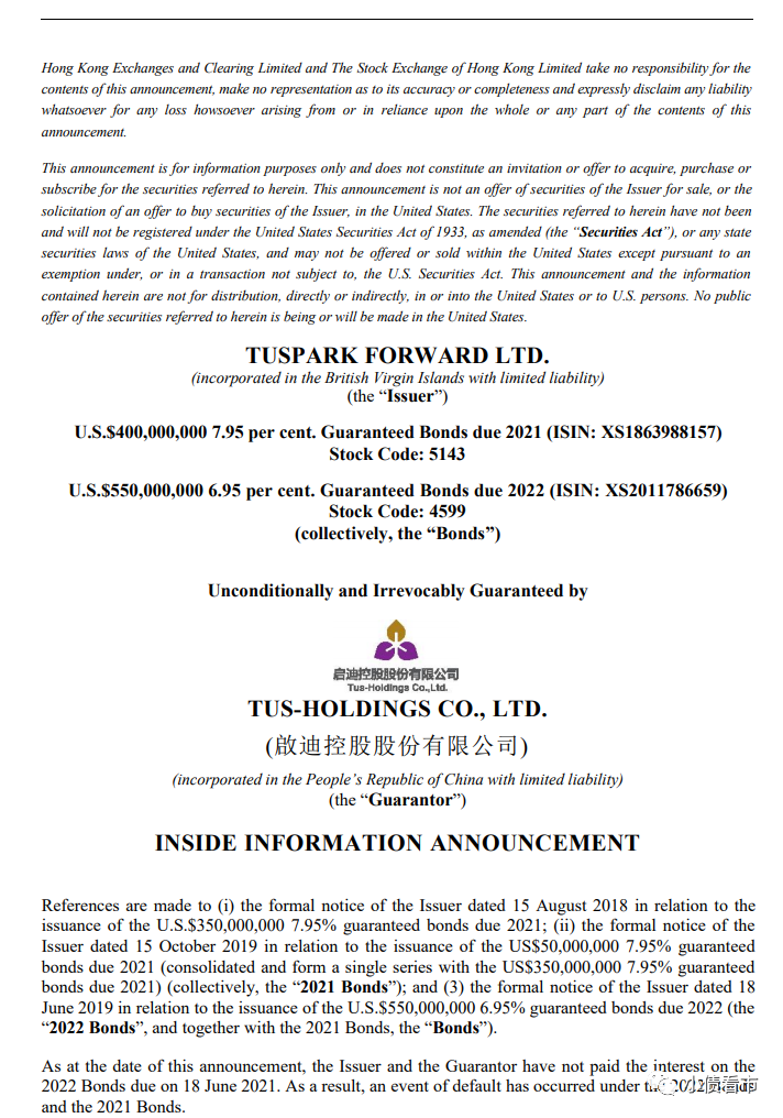 7月8日,啟迪控股股份有限公司(以下簡稱“啟迪控股”)公告稱,由于發行人及擔保人截至公告日尚未支付于2021年6月18日到期的THSCPA 6.95 06/18/22債券利息,其2022年和2021年美元債發生違約事件。