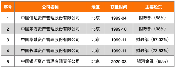 截至2021年2月,中國(guó)共有全國(guó)性AMC 5家,1999年批準(zhǔn)成立4家,2020年新批準(zhǔn)成立1家,注冊(cè)地均在北京。