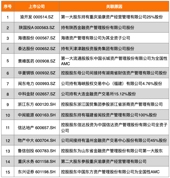 AMC概念上市公司15家,8家在深交所上市,7家在上交所上市,其中海德股份(000567.SZ)為A股唯一全資地方性AMC標(biāo)的。