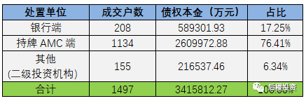 從阿里拍賣平臺中篩選出浙江地區債權(超過1000萬)成交記錄,總成交戶數1497戶,成交債權總本金341.6億,總成交價157.8億元,其中持牌AMC出讓比重接近80%。