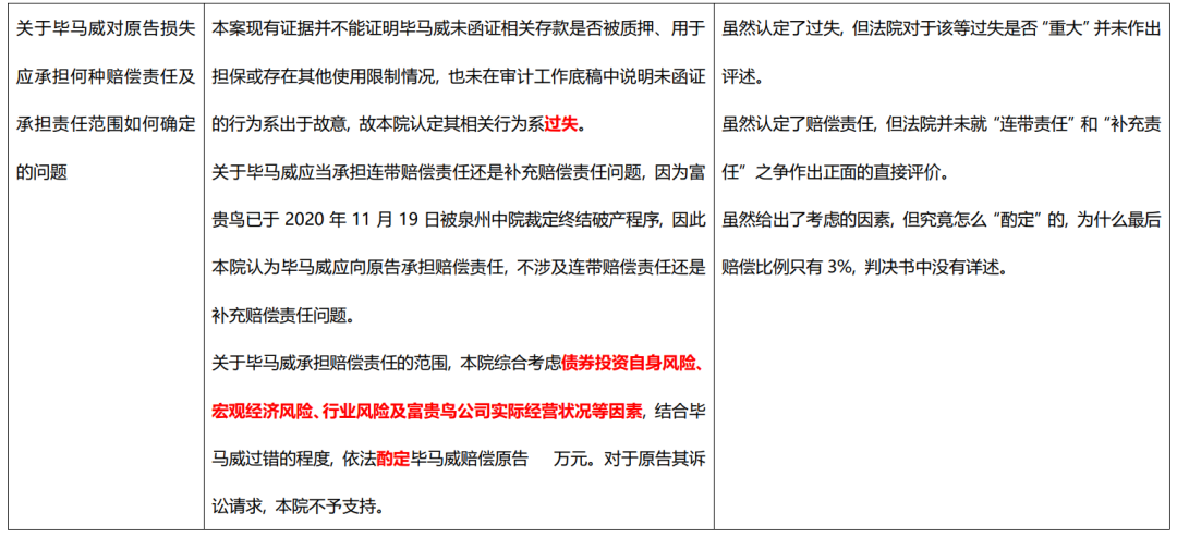 不得不說,富貴鳥案件的一審判決很有趣, 畢馬威在幾乎所有的爭議焦點都“輸”給了原告,但卻在最后的判決結果卻僅僅只需要承擔不足3%的賠償責任,可以說“贏”了結果。