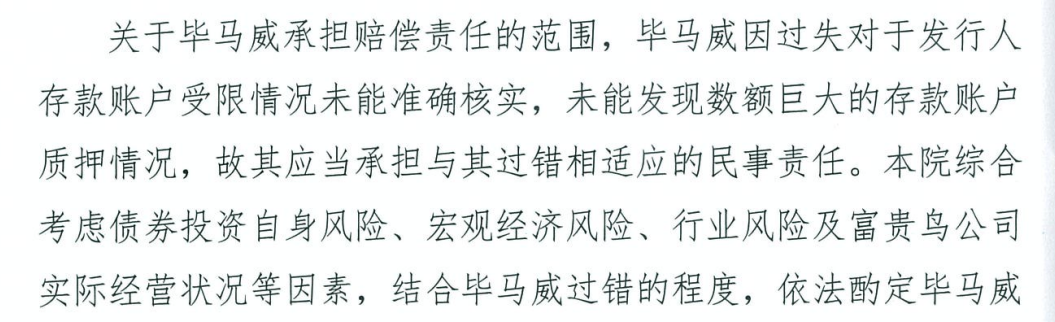 正如上文所述,在上述五個爭議焦點中,畢馬威的觀點幾乎都遭到了二中院的否定,但最終畢馬威所需承擔的賠償比例卻是極小的,而賠償比例的論述在法院的判決書中卻只有寥寥數(shù)行: