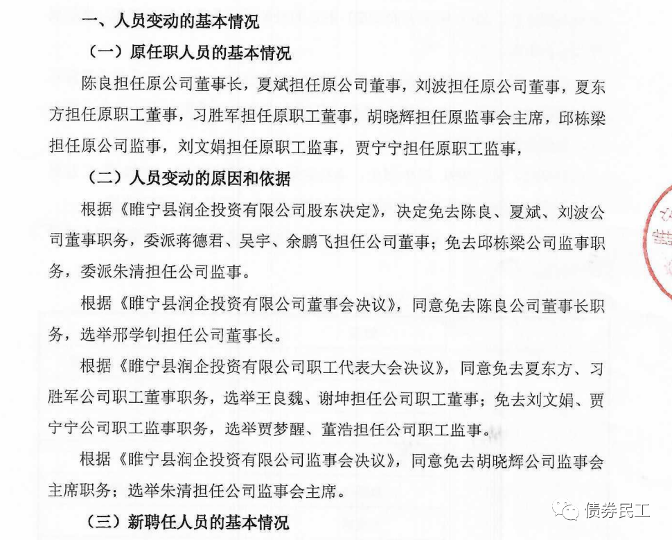 1、2022年1月18日,睢寧縣潤(rùn)企投資有限公司發(fā)布公告,公司的董事長(zhǎng)、監(jiān)事會(huì)主席以及部分董事、部分監(jiān)事進(jìn)行了變更。