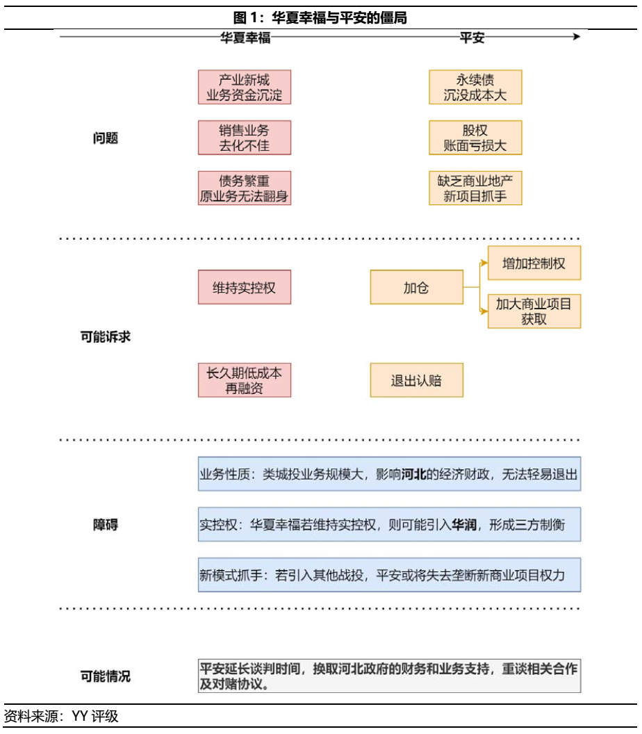 因此,近日根據外媒所披露的河北政府調停、財務援助和后續加大業務支持力度等一系列舉措,應能促進撮合華夏幸福和平安重啟新的協議和談判。但新的協議著力點在天秤的哪一端,仍取決于華夏幸福對于平安的未來價值。
