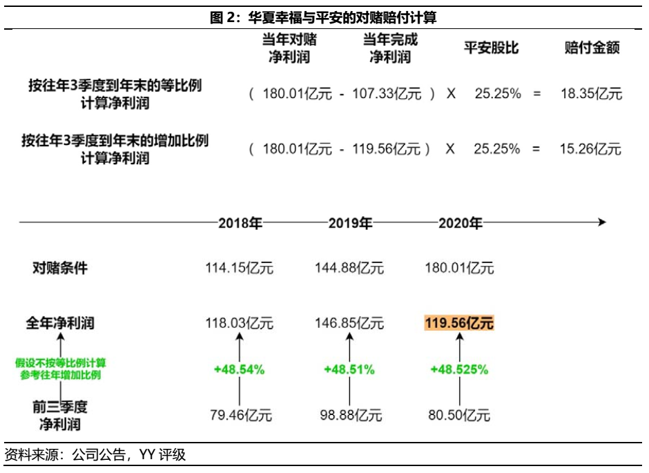 根據不同的測算方式,賠付金額約在15-20億元(據說這個小目標王文學也不打算給出來了,這也是矛盾導火索顯性化的原因)。根據平安兩次入股所設的對賭條件,賠付金額=(凈利潤目標-實際凈利潤)*平安股比,其中可根據圖2分別依據2020年前三季度凈利潤“等比例”或“依照往年比例”測算全年凈利潤規模,從而得出賠付金額可能在15億元至20億元之間。