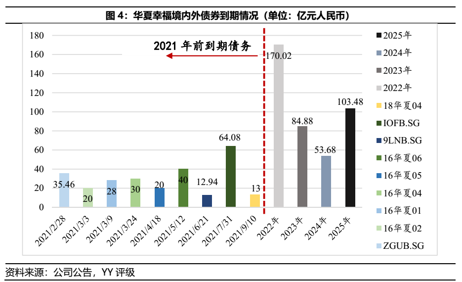 2021年迎來華夏幸福境內外債券到期高峰,年度到期債券約在263.50億元左右,償還壓力大。此外,若存量債務行權采回購統計,則16華夏債、19華夏01、18華夏02和18華夏03的行權日均于2020年上半年,2021年的兌付規模則在313.75億元左右。